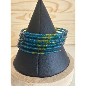 Beaded Wrap Bracelet With Silver Accents Adjustable Size Blue & Green