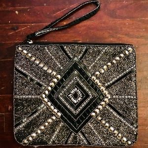 Black and silver beaded wrist-lit clutch. Vintage style circa 1920’s, purchased at a Paris flea market 2014. Never used, excellent condition. Staple piece w/ monotone dress, or however the hell you want to piece it ;-)
