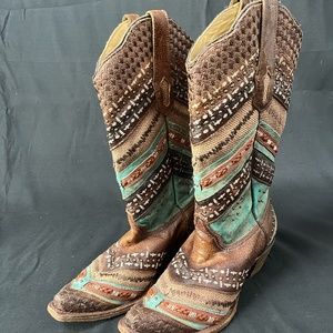 Handmade, one-of-a-kind indigenous craftsmanship. Rich brown distressed leather intricately stitched cowboy boots with mixed materials and blue detailing with brass studs. Please keep in mind the leather is stiff. It has been worn once, not broken in. Great for fall. In great condition with minimal wear and tear on the soles.