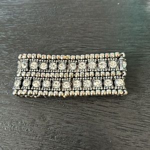 I do think someone told me it is Swarovski stones but I’m not sure. 🤷🏻♀️ It is a durable elastic holding the beads so it is OS.