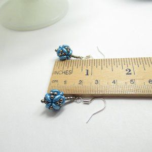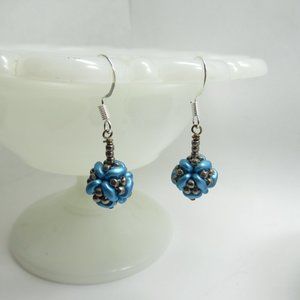 This listing is for the hand stitched beaded bead earrings pictured. These were crafted by me using blue colored Glass Superduo Czech two hole beads and chrome silver colored seed beads. These are made with my own pattern. They hang from silver plated nickel free earwires. They are in good unworn condition.