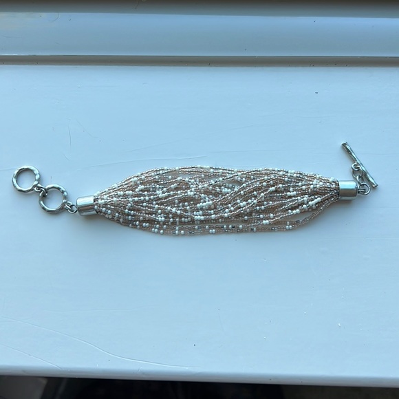 Multiple strands, tan and white beaded bracelet.