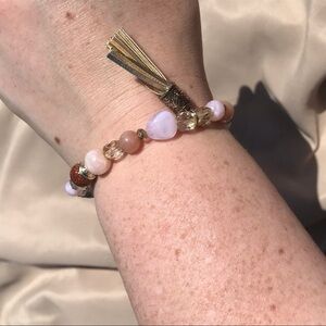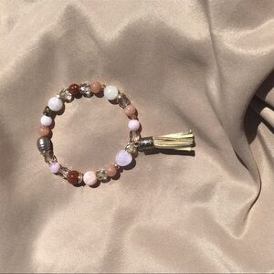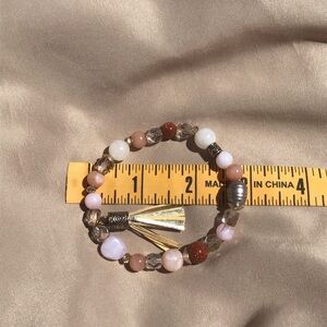 This bracelet is in excellent preowned condition. It’s made of a stretchable elastic brand with mismatched beads in neutral tones of varies textures, shapes, some have glitter with a leather tassel (not sure genuine or faux leather).