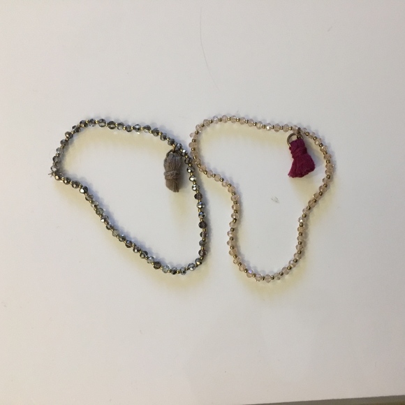 Elastic beaded bracelets. One in gray and one in light pink, each with small tassels.