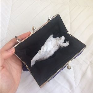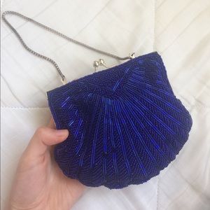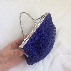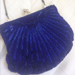 Midnight blue beaded evening bag with silver chain and closure. Slightly tarnished chain. Great condition/ only used a few times. Dimensions: 6" by 5" by 1"