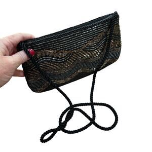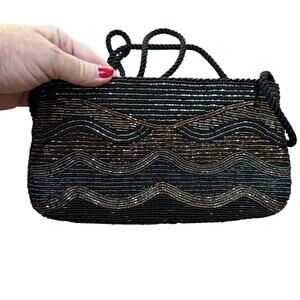 Beaded evening bag dressy 1990’s black satin gold beads dressy shoulderbag purse