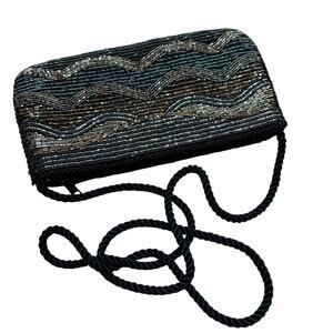 Vintage Beaded evening bag - dressy 1990’s black satin purse with goldtone, silvery blue & coppery red beads design. Satin shoulderbag cord and top zipper closure. Black satin lining with one side slide pockets. This bag is in excellent condition - no apparent damage or flaws - just stunning!
