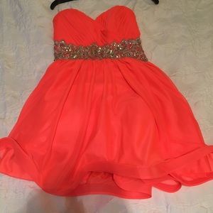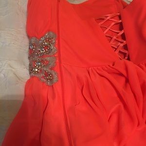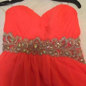 Bright orange/salmon colored homecoming dress with beaded and embroidered waist. Strapless with elastic to hold the top up and padding in chest. Tulle top layer with underskirt to add volume. Only worn once, super gorgeous with lattice back.