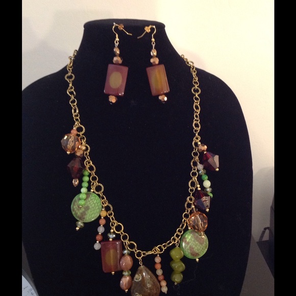 New Handmade costume jewery. Made with beads, stones, and gold like accessories & chain. Beads and stones are green shades, white, natural, brown like colors. It's various color's are a natural beauty to one's eyes. One of a kind.