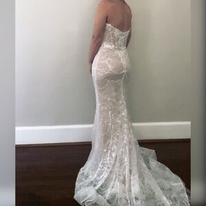 NO LOWBALL OFFERS. New with tags! Sexy sparkly beaded Long sleeve wedding dress, reception dress, bachelorette party, bridal shower, formal or elopement dress. Sweetheart neckline with unique back and bell sleeves. White over nude. Bridal size 10 from NoxAnabel brand