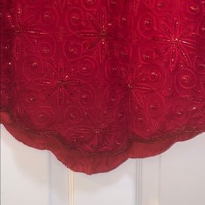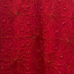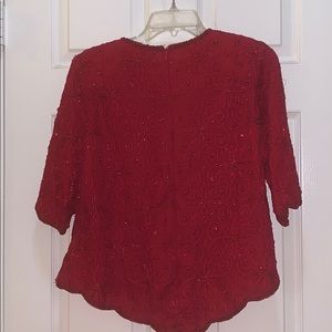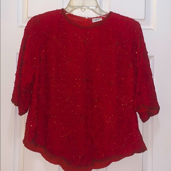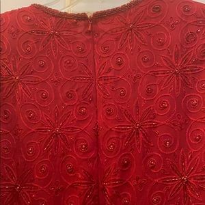 Beautiful red beaded top with hidden zipper in back. Sleeves are bell shaped longer short sleeve length. Pattern is floral like a poinsettia. Bottom is scalloped trimmed in beading. Perfect to wear to any holiday event. No brand name listed. Size Large