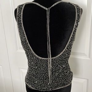 Beaded top with low-cut back in very good condition. Perfect for any formal occasion. Polyester lining. Shell 100% silk. Spot clean only. Size large.