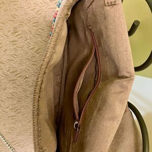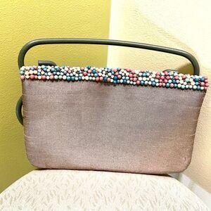 Beaded beauty! On long chain, handle drop:20”, 10x7, snap closure, 2 small pockets, 1 larger pocket, mauve silk fabric lining . Really cute bag!