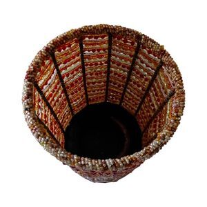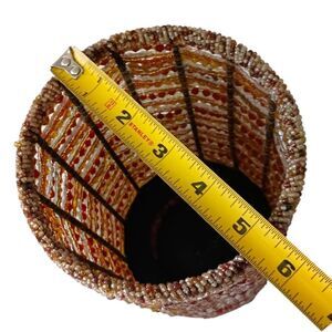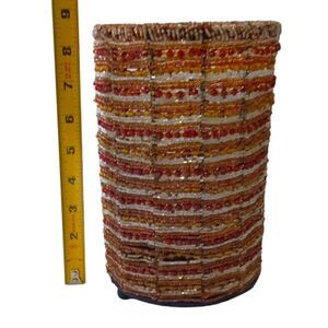 Beaded Candle Holder Glass Seed Bead Pillar Tall Bohemian Moroccan Red Gold Vtg. Condition is pre-owned and vintage 1980 to 1990s. Made of wired glass beads. Unbearable. Holds a tall pillar candle. No loose or missing beads. Does have wear to the metal plate on the bottom. Measures about 8.5" x 5.5". Please see all photos for detailed condition.