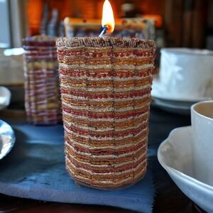 Beaded Candle Holder Glass Seed Bead Pillar Tall Bohemian Moroccan Red Gold Vtg.