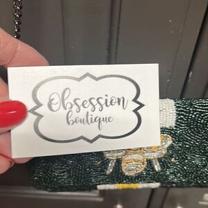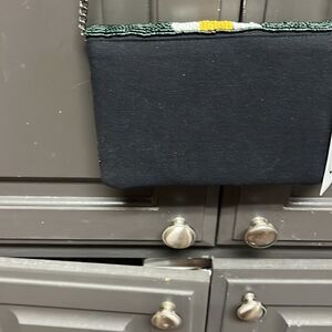 Beaded small Crossbody purse. It is green beaded with white, yellow and gold bee on it