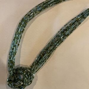 Pretty beaded knot necklace with multicolored beads in greens and blues joined together for a beautiful look. Extension chain with lobster claw clasp.