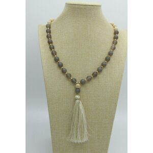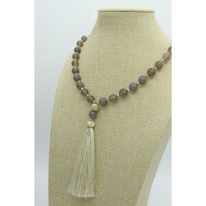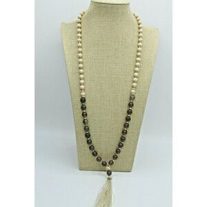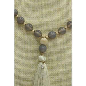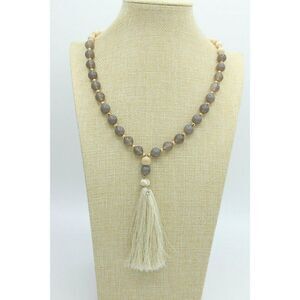 Beaded Necklace with translucent gray glass beads and light colored wood beads, Gold Tone beads and chain/clasp. Thread Tassel. Approx. 30"