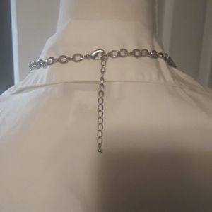 New. Silvertone Multibead Multistone Statement Necklace. 4 Dangles from a Cirle Hoop Pendant. Silvertone Chain Length 21 inches, Extender 2 inches. Lobster Clasp.