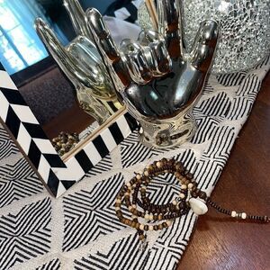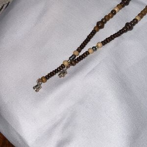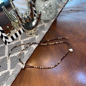 Chain that can act as waist chain or wrapped anklet, bracelet, necklace. Includes screw closure and various wooden beads and shells. Approx 37” from closure to closure.