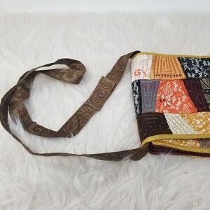 Bright vivid quilted crossbody bag with beaded accents. Bag is approximately 9" x 7.5" x 3" . Strap is approximately 39" and has a cute bow detail as in pics 3 and 4. Very clean almost like new condition.