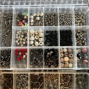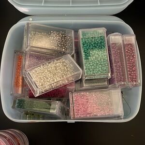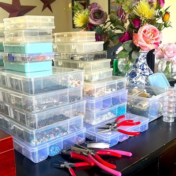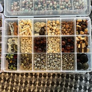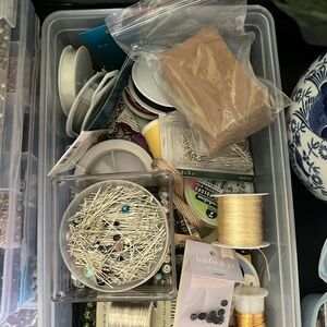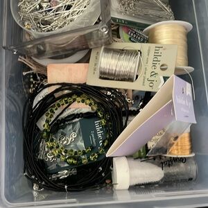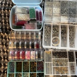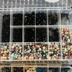 These beads are beautiful. Theres mostly glass. Everything you need to make jewelry. Wire, needles, tools, thread , and findings! This is a huge lot! And tons of loose beads i was not able to take pics of all of it.