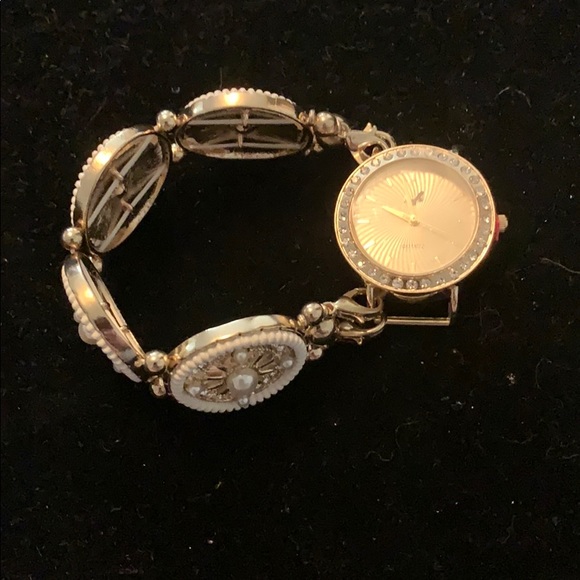Handmade stretchy bead and metal band. It has a quartz watch face outlined with beautiful crystals. You can remove the band at both ends.