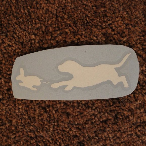 Beagle Chasing Rabbit Decal. This item is premade and ready to ship. This would be perfect for your car! Made with premium quality permanent vinyl that will not fade.