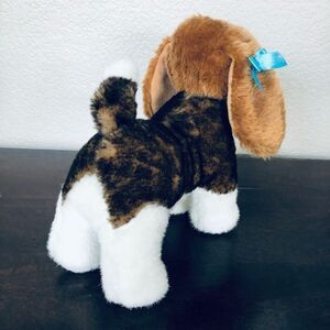 Tricolor beagle dog plush stuffed animal, stands about 8” tall. Blue bow on ear.