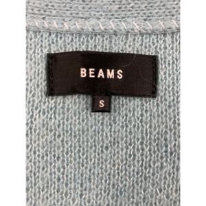 Soft light blue mohair-blend cardigan by BEAMS, featuring a classic V-neckline, button-front closure, and slightly cropped relaxed fit. Fluffy texture gives a cozy, elegant look suitable for layering or casual chic styling.