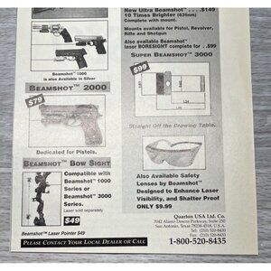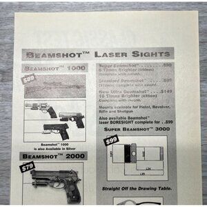 Step into a bygone era of precise innovation with this vintage advertisement for Beamshot Laser Sights. Highlighting products like the Standard Beamshot 1000, Ultra Beamshot 3000, and specialized bow sights, this piece captures the evolving technology for firearms and bows.