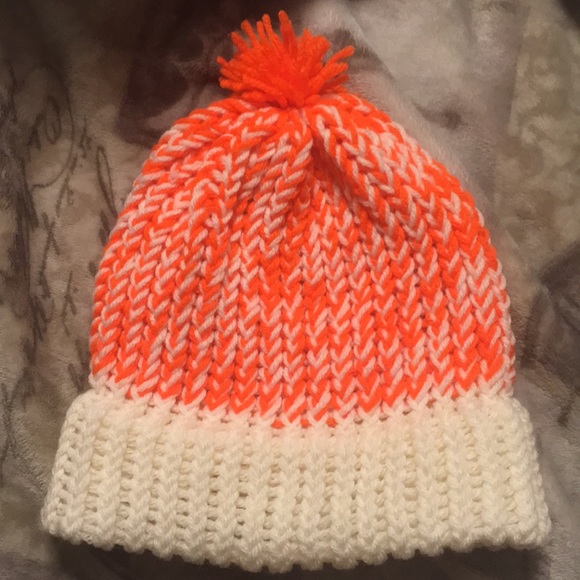 White and orange homemade beanie great for winter! Super comfortable and fits almost everyone!