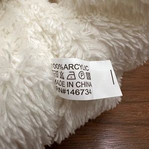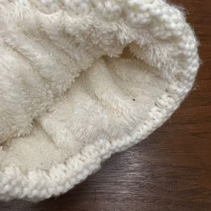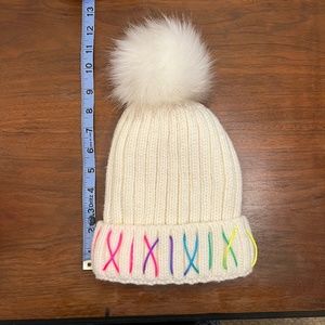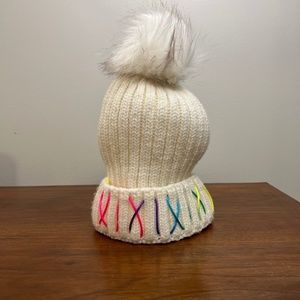 Cute, stylish white beanie with fluffy white pom. Colorful stitching along front. One size fits all made from Acrylic.