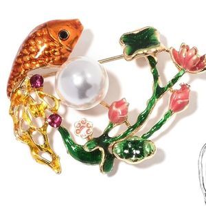 Beanie Hat Slouch Skull Cap Blue and Austrian Crystal Pearl Multi Color Fish Brooch