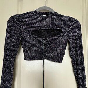 Fun and edgy Bear Dance black top, size medium. Features sparkly fabric plus cut-out and lace-up details—perfect for nights out!