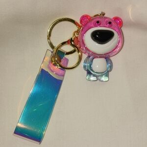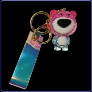This adorable keychain features a vibrant pink bear design, perfect for adding a playful touch to any accessory collection. The shimmering blue strap adds a fun, iridescent flair. Ideal for kids who love colorful and unique accessories.