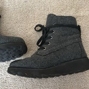 Good condition with minor wear. A small wedge. See photos for details and measurements. No major flaws. Keep your feet warm and stylish with these gray winter boots. Perfect for cold weather adventures.