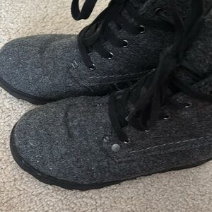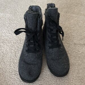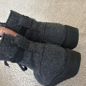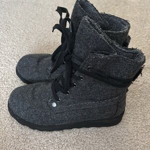 Good condition with minor wear. A small wedge. See photos for details and measurements. No major flaws. Keep your feet warm and stylish with these gray winter boots. Perfect for cold weather adventures.
