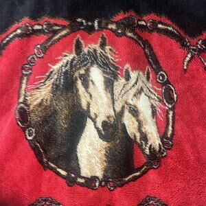 Collar and lining are thick black fleece for added warmth. Western/ranch inspired design, prominent horses graphic art, and rich color scheme.