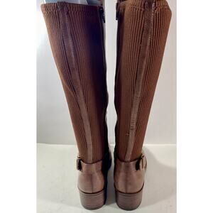 Bear Traps knee high equestrian in Mckayla style. Has almond shaped toe, ankle strap with buckle, and full inner calf zipper. Flat style heel measures 1 1/2" tall, shaft of boot approximately 14" tall, and calf approximately 16" at widest point. It also has strips of ribbed stretch fabric along the sides that can expand for good fit. Size 9M. Man made upper. Boots are new/unworn without box. Please email with any questions.