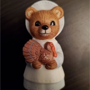 3 Thanksgiving Bear figurines. These figurines are small but adorable. They measure about 1 1/2 inches wide and 2 inch and 3 inches tall. They would make a great addition to anyones Thanksgiving decor. The are from Home Interior