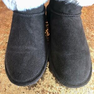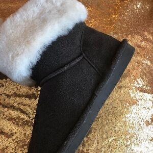 Cozy winter boots with a soft cream cuff. Durable brown suede exterior. Perfect for cold weather.