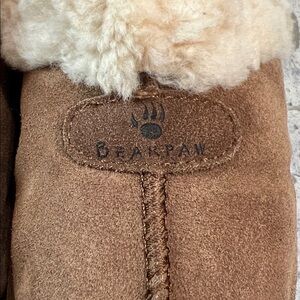 Comfortable BearPaw slippers in tan suede. Soft cream lining for warmth.