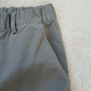 In excellent condition, gray/green color, elastic waist, 7"inseam, front pockets, one back button pocket, 97% cotton/3% spandex, size small.