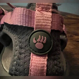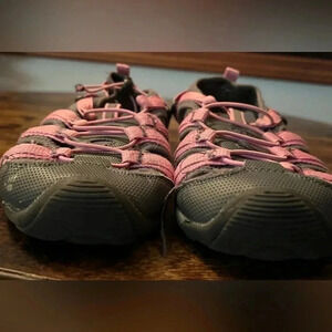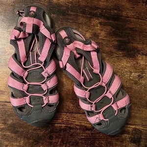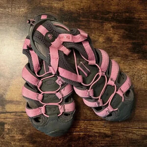 Bearpaw | Memuru youth hiker sandals. Size: 4. Colors: pink and gray. Bearpaw logo on shoes. Elastic pull string/bungee toggle and rubber soles. Comfortable summer sandal! Brand new, never worn. NWOT.