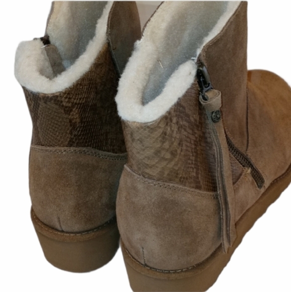 Suede Bearpaw boots with Sherpa lining size 7 excellent condition never used new without tag tan with snakeskin print on the back