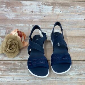 Elasticized cross straps bridge a comfort-centric sandal fashioned in a sporty knit fabric. Set atop a cushy, molded EVA foam footbed, lightweight, flexible blown EVA outsole with rubber inserts ensure traction and durability.