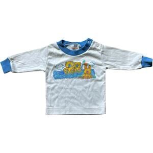pastel cartoon animals teddy bear graphic bunny print soft vintage babywear retro babycore infant fashion nostalgic style gender neutral baby clothes illustrated baby tee blue trim made in usa vintage baby top giftable kidswear collectible baby aesthetic retro nursery vibes silverlake rosebowl flea true vintage