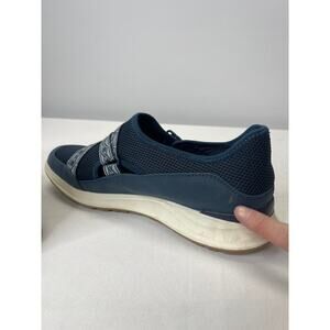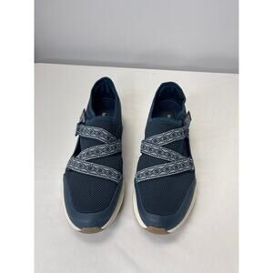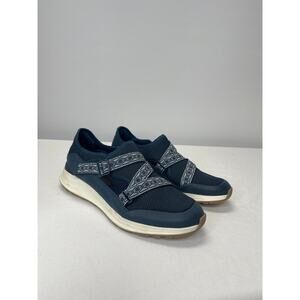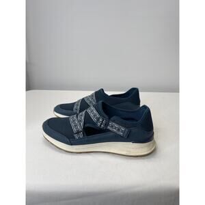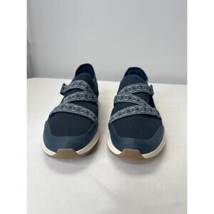 Dark blue base sneakers with lighter blue elastic straps across the toes. Elastic is adjustable on the sides with a velcro adjustable clasp. Memory foam insoles for comfort and arch support. Small scuffs on the heel but otherwise very good used condition.