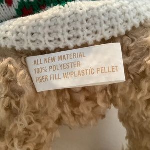 Adorable brown bear named "Samuel Lord-Bear" sports an ivory and red and green sweater with matching hat.